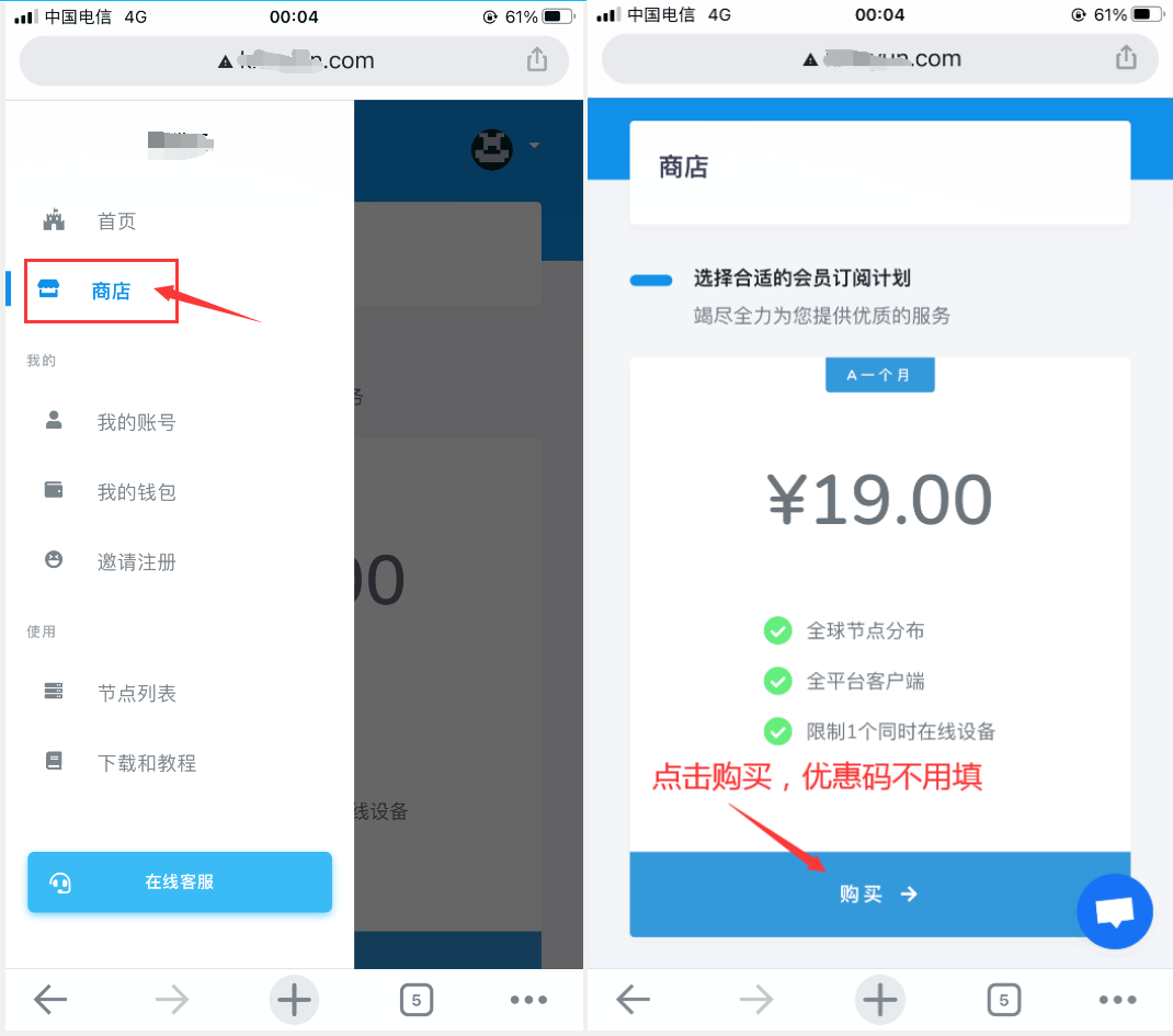 2.去商店购买套餐(把刚刚充值的金额用啦,不用您再掏钱啦,优惠码不用填直接下一步)